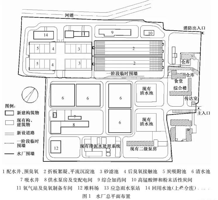 ?。?)構(gòu)筑物多、設(shè)備陳舊、總圖凌亂。水廠自建成的近60年時(shí)間里,先后經(jīng)歷多次擴(kuò)容、改造,形成了現(xiàn)在多個(gè)處理構(gòu)筑物,總圖布置分散、凌亂,且多個(gè)構(gòu)筑物和很多設(shè)備都存在問題。如現(xiàn)有吸水井分為高、低水位2格吸水井,多年運(yùn)行管理實(shí)踐表明高、低水位運(yùn)行切換麻煩,節(jié)能效果也不明顯;加藥間設(shè)備陳舊需要逐一更換,其內(nèi)部布置、土建分隔亦有多處需要改造,而且現(xiàn)有工藝設(shè)備也不能滿足新增加藥劑的要求;水廠的清水池庫容僅2.2萬m3,庫容偏??;2座二級(jí)泵房和2座原水泵房內(nèi)水泵機(jī)組匹配都不合理、效率低下、自動(dòng)化程度低。
