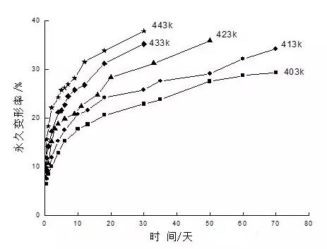 圖4不同溫度下密封圈壓縮永久變形與時(shí)間的關(guān)系